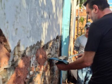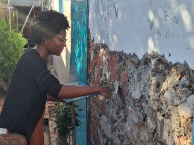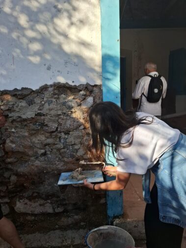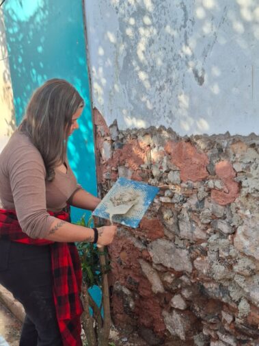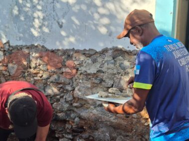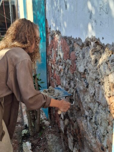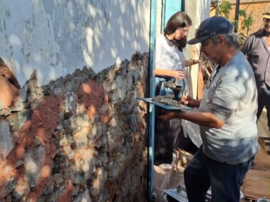 Um dos momentos marcantes da oficina foi a retirada de uma camada de argamassa cimentícia que recobria parte da capela. Sobre essa superfície, os participantes aplicaram um chapisco simbólico com argamassa de cal, deixando ali suas marcas: registros afetivos que agora integram a intervenção atual no edifício.