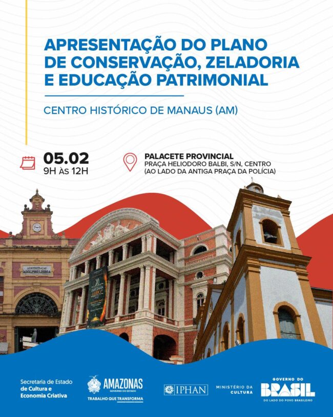 ZoomDetails Apresentação do Plano de Conservação, Zeladoria e Educação PatrimonialEventosPor Instituto Sarasájaneiro 30, 2026Data: 05/02/2026 Horário: 09:00 Local: Palacete Provincial, Praça Heliodoro Balbi, S/N, Centro, Manaus
